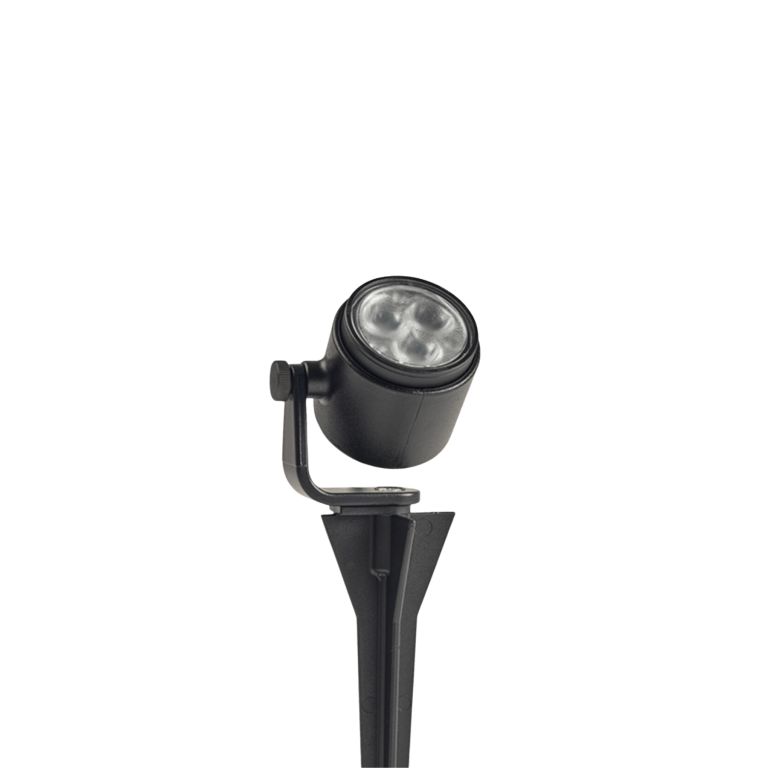 Buitenspot MINI SCOPE wordt standaard geleverd met een beugel en grondpen. Uitermate geschikt om te plaatsen tussen beplanting, struiken en kleine boompjes. Het armatuur is ook zonder grondpen te gebruiken als wandarmatuur.